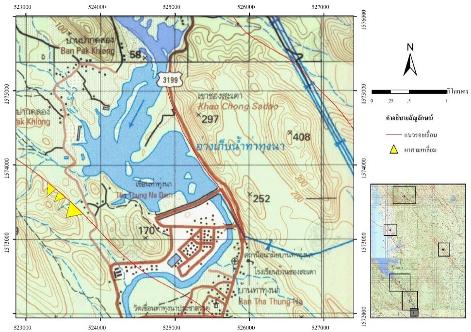 2. กำหนดพื้นที่และวางแผนเส้นทางที่จะสำรวจภาคสนาม โดยพิจารณาจากความเหมาะสมด้านความสะดวกในการเข้าถึงพื้นที่ และเป็นพื้นที่ที่เคยมีการสำรวจรอยเลื่อนมาแล้ว