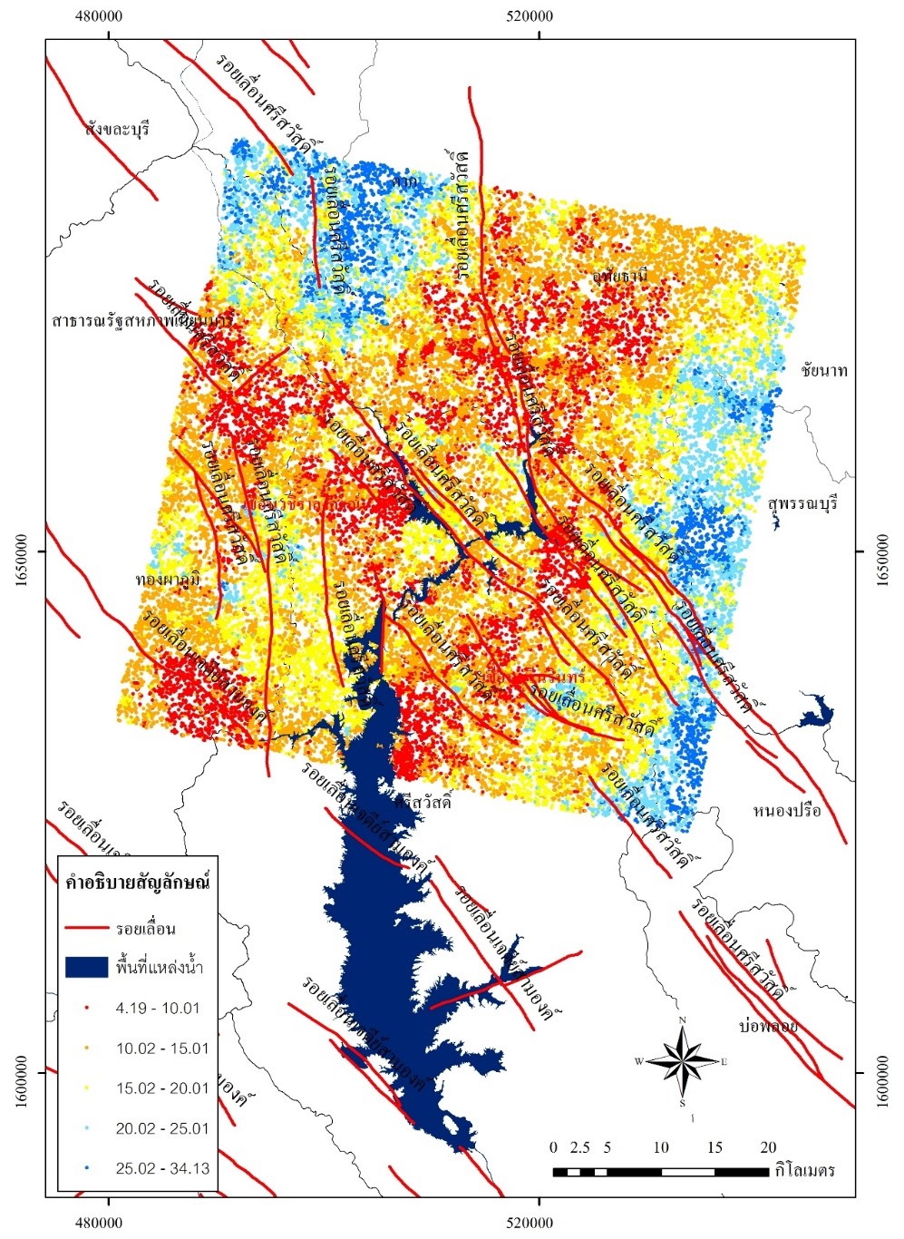 เมื่อนำค่าความเร็วของการเคลื่อนตัวมาซ้อนทับกับแนวรอยเลื่อนศรีสวัสดิ์เพื่อวิเคราะห์การเคลื่อนตัวในแนวรอยเลื่อนดังภาพที่ 13