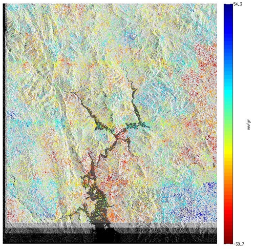 ภาพที่ 11 แสดงอัตราการเคลื่อนตัวจากข้อมูล PS Points มีค่าการเคลื่อนตัวเป็นหน่วยมิลลิเมตรต่อปีนำค่าที่ได้มาซ้อนทับกับ Amplitude Image ซึ่งแสดงถึงลักษณะภูมิประเทศ