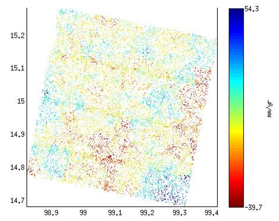 ผลการศึกษาพบว่าข้อมูลจุดที่ให้ค่าสะท้อนกลับของสัญญาณที่คงที่และถาวร (PS Points) จำนวนทั้งสิ้นจำนวน 44,788 จุดหากคิดเป็นพื้นที่ต่อ 1 ตารางกิโลเมตรจะเท่ากับ 1 ตารางกิโลมตรมีจำนวนจุดประมาณ 18 จุด ซึ่งเพียงพอต่อการประมวลผลด้วยค่า Time-series INSAR เพื่อใช้วิเคราะห์การเคลื่อนตัวของแผ่นดิน ผลการวิเคราะห์หลังจากทำการให้ค่าพิกัดภาพให้อยู่ในระบบพิกัดของเรดาร์แล้วพบว่า อัตราการเคลื่อนตัวในทิศทางของเรดาร์ LOS มีอัตราการเคลื่อนตัวระหว่าง ค่าการเคลื่อนตัวมีค่า -39.7 ถึง 54.3 มิลิลเมตรต่อปี ดังภาพที่ 11