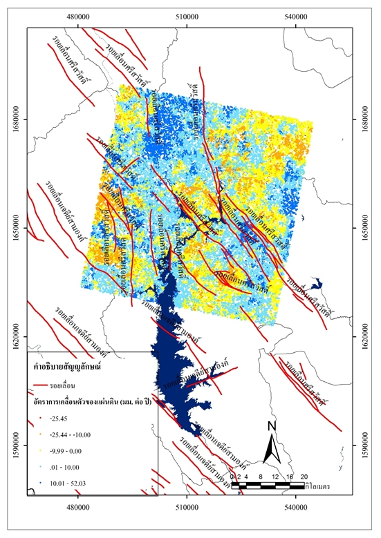 ภาพที่ 12 แสดงอัตราการเคลื่อนตัวจากข้อมูล PS Points มีค่าการเคลื่อนตัวเป็นหน่วยมิลลิเมตรต่อปีนำค่าที่ได้มาใส่พิกัดภูมิศาสตร์เพื่ออ้างอิง