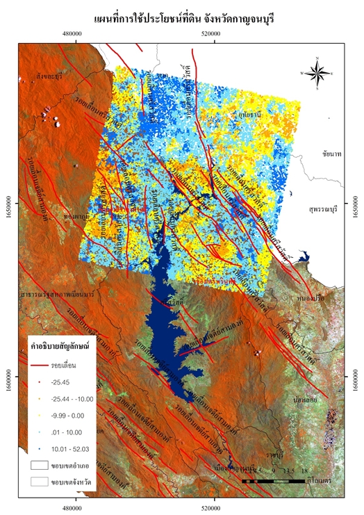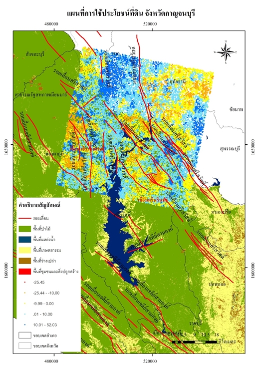 ภาพที่ 15 แผนที่แสดงการเคลื่อนตัวซ้อนทับกับลักษณะการใช้ประโยชน์ที่ดินในจังหวัดกาญจนบุรี