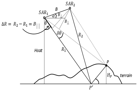 InSAR (Interferometric Synthetic Aperture Radar) คือ เทคนิคที่ดีอีกวิธีหนึ่งในการหาความสูงภูมิประเทศสำหรับงานทางด้าน Remote Sensing หลักการทำงานที่สำคัญของเทคนิค InSAR คืออาศัยการวิเคราะห์ผลต่างเฟสของภาพ SAR ตั้งแต่สองภาพขึ้นไป (Phase Differential) ซึ่งภาพทั้งสองจะถูกบันทึกในตำแหน่งเดียวกันแต่คนละช่วงเวลา ผลต่างเฟสนี้สามารถนำมา สร้างแบบจำลองความสูงภูมิประเทศ (DEM) และสามารถศึกษาถึงรูปแบบการเปลี่ยนแปลง (Deformation Pattern) ในลักษณะต่างๆ ที่เกิดขึ้นบนโลก ภาพที่ถูกสร้างจากผลเฟสที่ต่างกันนี้เรียกว่า Interferogram เทคนิค InSAR เป็นเครื่องมือในการติดตามการเปลี่ยนแปลงที่ให้ระดับความถูกต้องถึงมิลลิเมตร สามารถวิเคราะห์พื้นที่ที่ยากต่อการเข้าถึง เช่น พื้นที่ภูเขาสูง พื้นที่ที่มีความลาดชัน เป็นต้น ทำให้ได้ข้อมูลในการวิเคราะห์ที่ต่อเนื่อง ซึ่งการนำเทคนิค InSAR มาใช้ในการศึกษาจะเป็นประโยชน์อย่างยิ่งในวิเคราะห์การเปลี่ยนแปลงและติดตามการเคลื่อนตัวของแผ่นดินในบริเวณรอยเลื่อนมีพลังได้ โดยมีรายละเอียดในการทำงานของ InSAR ดังภาพ