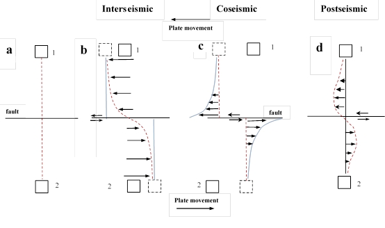 ภาพที่ 1 การเคลื่อนตัวทางราบในแต่ละขั้นตอนของวงจรการเกิดแผ่นดินไหว ซึ่งอธิบายด้วยแบบจำลอง Reid’s Elastic Rebound โดยดัดแปลงให้สอดคล้องกับรอยเลื่อนเหลื่อมซ้าย (ดัดแปลงภาพจาก Wright, 2002; Thatcher, 1993)