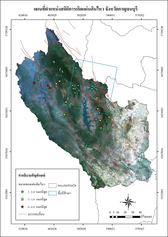 ภาพที่ 2 แผนที่ตำแหน่งสถิติการเกิดแผ่นดินไหวซ้อนทับกับภาพถ่ายจากดาวเทียม Landsat-8 จังหวัดกาญจนบุรี แผนที่ดัดแปลงมาจาก ข้อมูลตำแหน่งการเกิดแผ่นดินไหวจาก xx