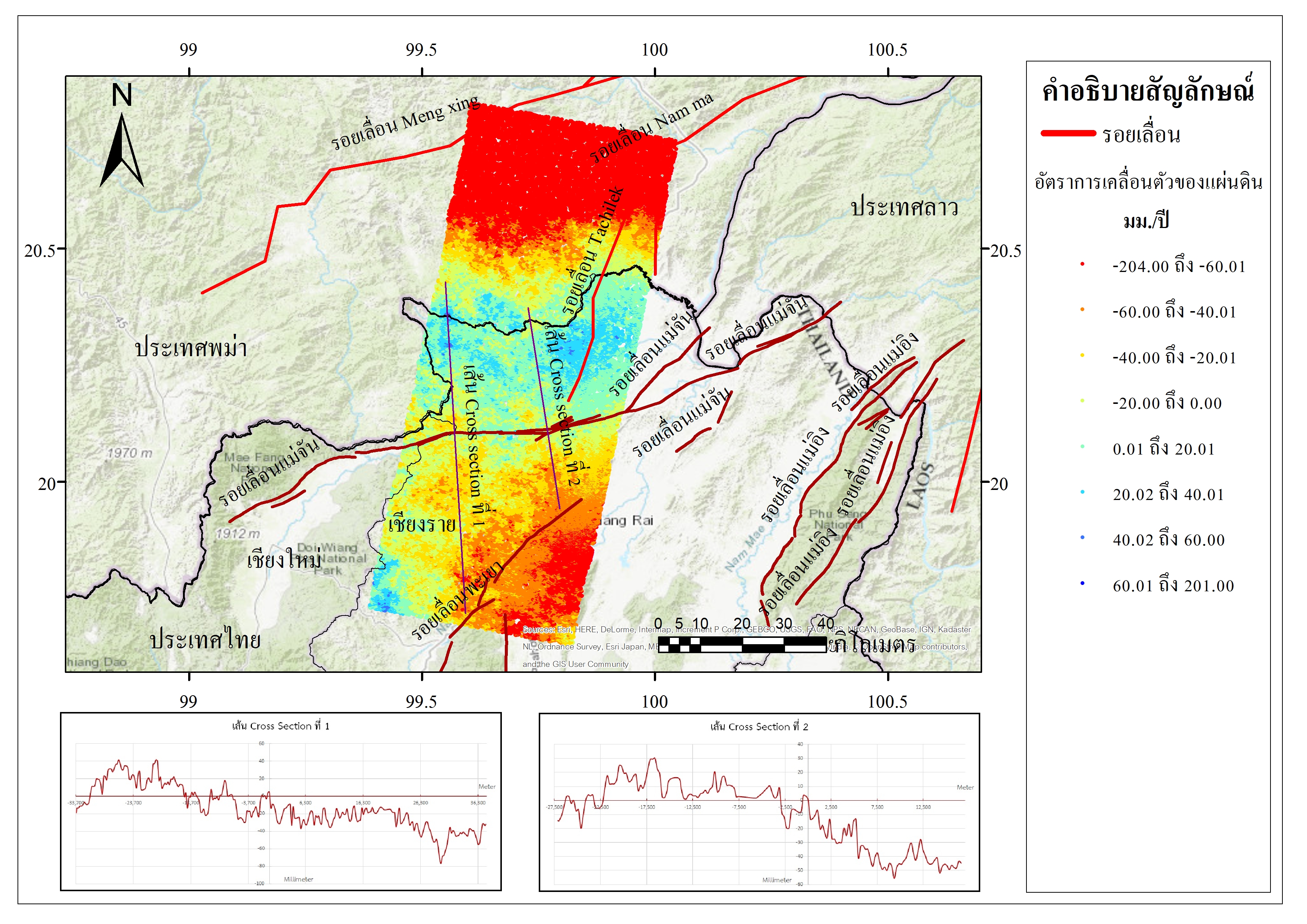 รูปที่ 1 แผนที่แสดงถึงอัตราการเคลื่อนตัวบริเวณสองฝั่งแนวรอยเลื่อนแม่จันจากภาพรอยเลื่อนพาดผ่านเริ่มตั้งแต่บางส่วนของ อ.แม่อาย อ.เมือง และ อ.แม่จัน จุดการเคลื่อนตัวในโทนสีฟ้าและสีแดงแสดงให้เห็นถึงทิศทางการเคลื่อนตัวระหว่างสองฝั่งแนวรอยเลื่อนอันมาจากแรงเค้นที่มากระทำในช่วงวัฎจักรที่เรียกว่า Interseismic motion เส้นสีชมพูทั้งสองเส้นแสดงถึง Cross section เส้นที่ 1 และ 2 เพื่อหาความเร็วระหว่างสองฝั่งแนวรอยเลื่อนออกไป