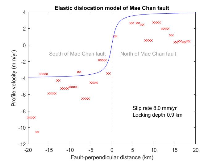 รูปที่ 2 จุดกากบาทสีแดงคือความเร็วเฉลี่ยในแต่ละฝั่งของแนวรอยลื่อนไปทุกๆระยะ 500 ม. เส้นสีน้ำเงินแสดงถึงค่าอัตราการเคลื่อนตัว (slip rate) ระหว่างสองฝั่งแนวรอยเลื่อนมีค่าประมาณ 8 มิลลิเมตรต่อปี ความลึกของการยึดติดกันของรอยเลื่อน (locking depth) มีค่าประมาณ 0.9 กิโลเมตรจากพื้นผิวดิน